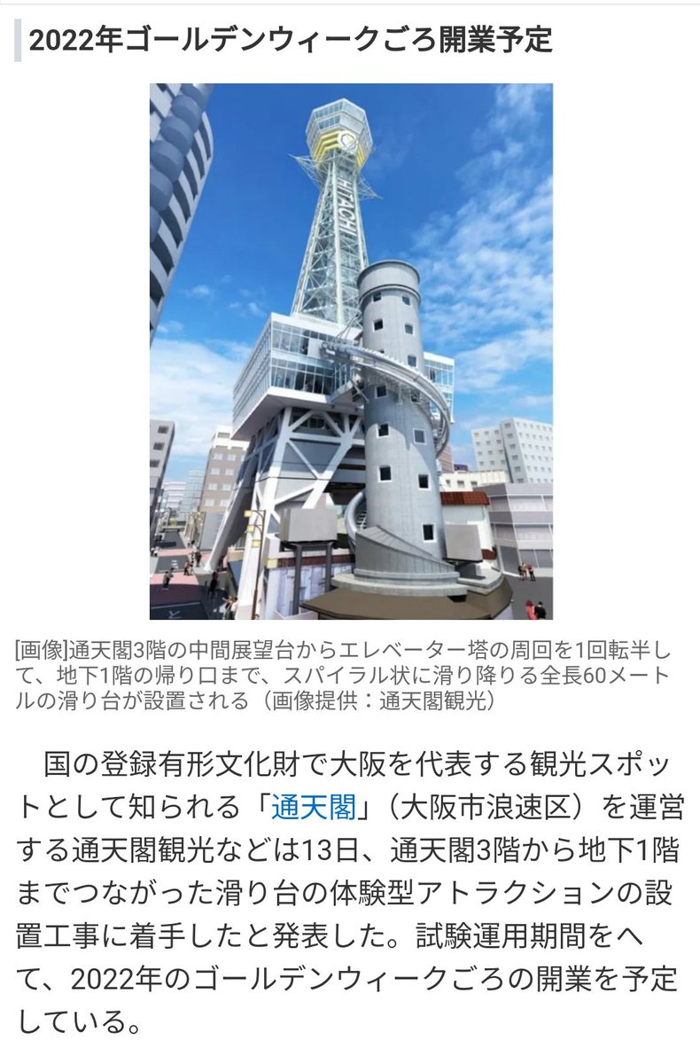 国の登録有形文化財で大阪を代表する観光スポットとして知られる「通天閣」(大阪市浪速区)を運営する通天閣観光が昨年12月から行っていた全長60メートルの滑り台の体験型アトラクション「TOWER SLIDER(タワースライダー)」の工事がこのほど完成。16日には関係者向けの体験試乗会が行われた。タワースライダーは5月9日から運用を開始する予定となっている。