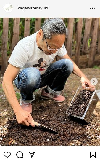 写真も、いずれも同じもので、1枚目は、白髪交じりの長髪を後頭部でお団子にし、眼鏡をかけた状態で、左手に土の入ったケースを持ち、右手のスコップで土いじりしている。2枚目は幼児を抱きかかえつつ、カブトムシの幼虫を指さして何か話し掛けている様子だった。