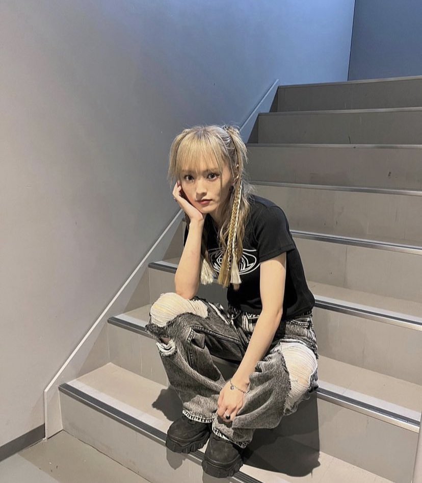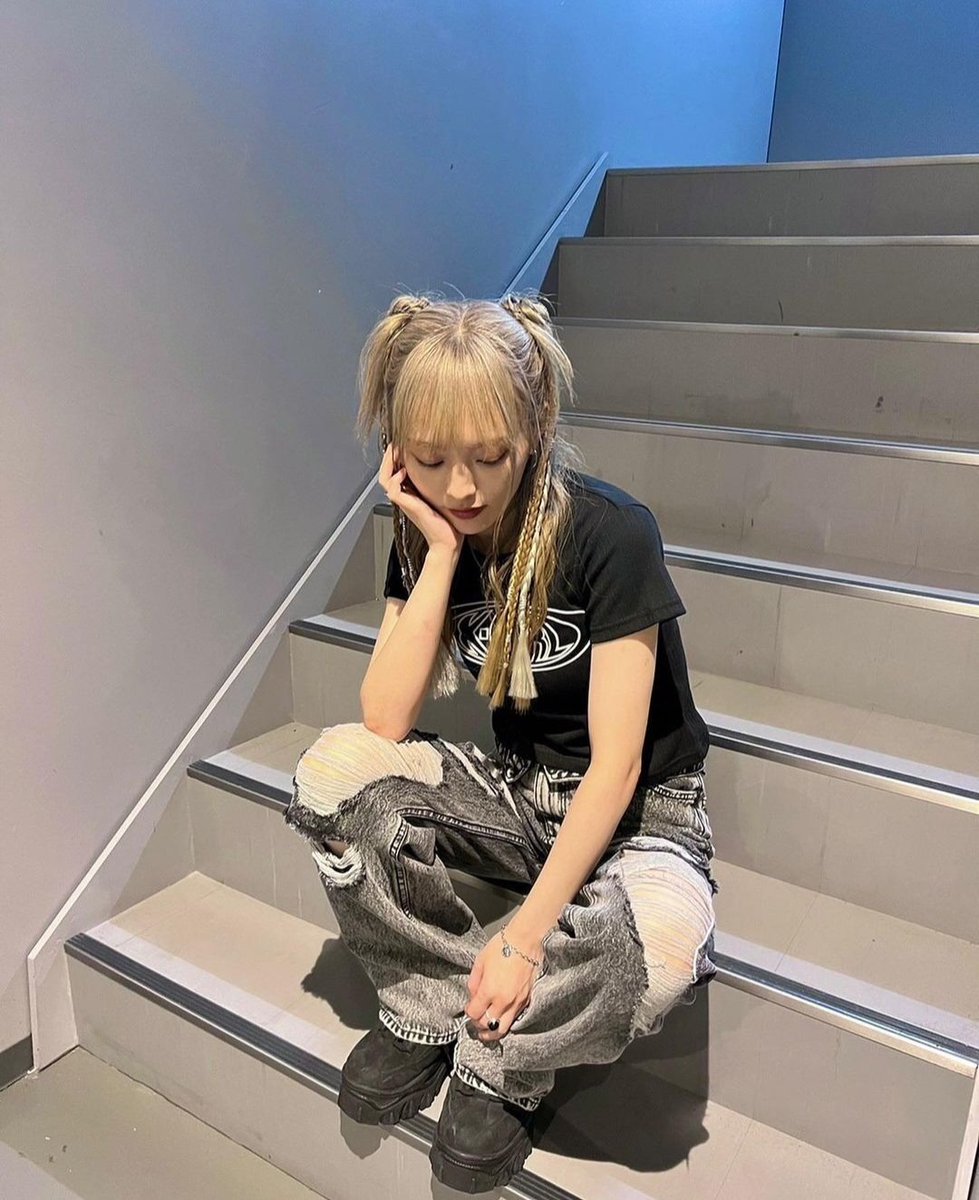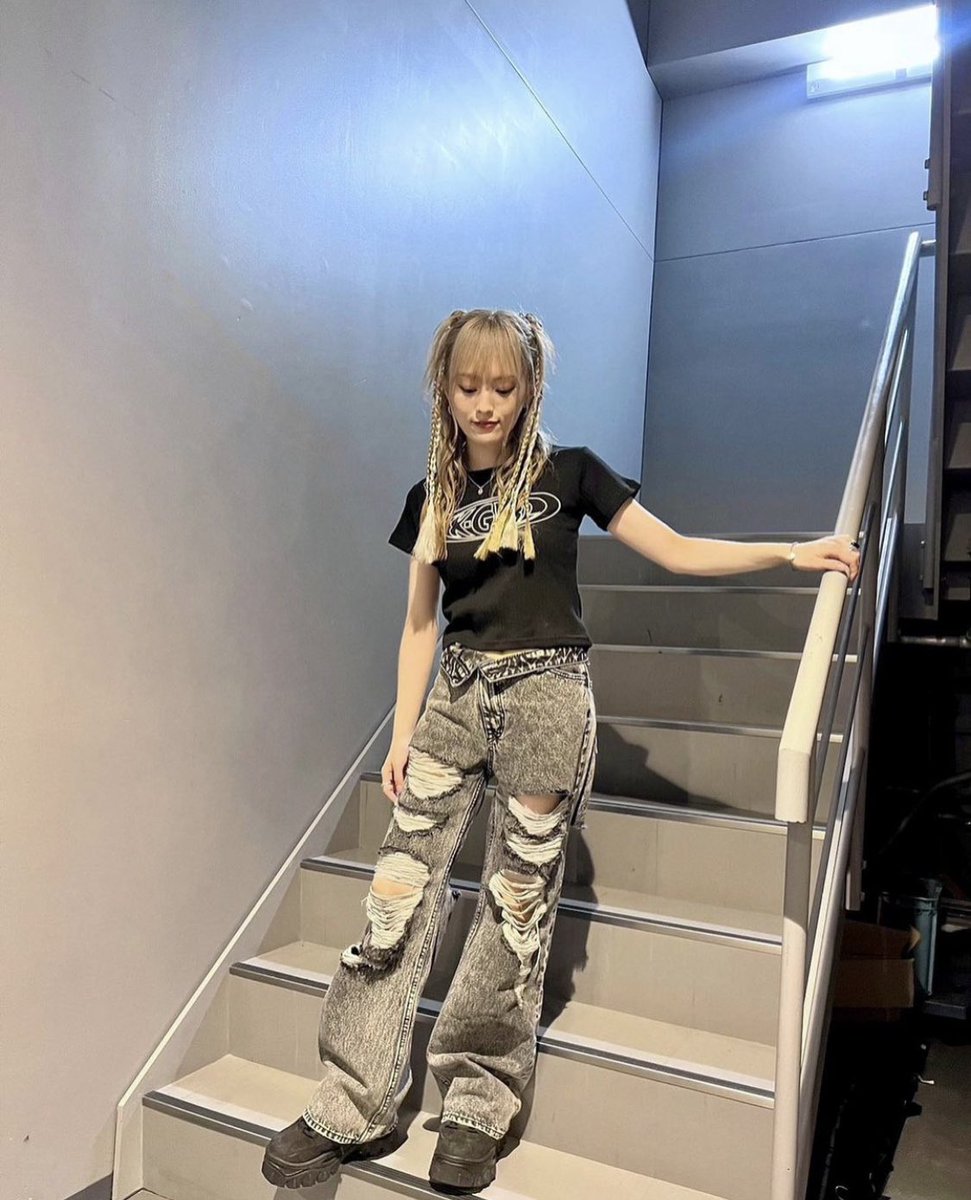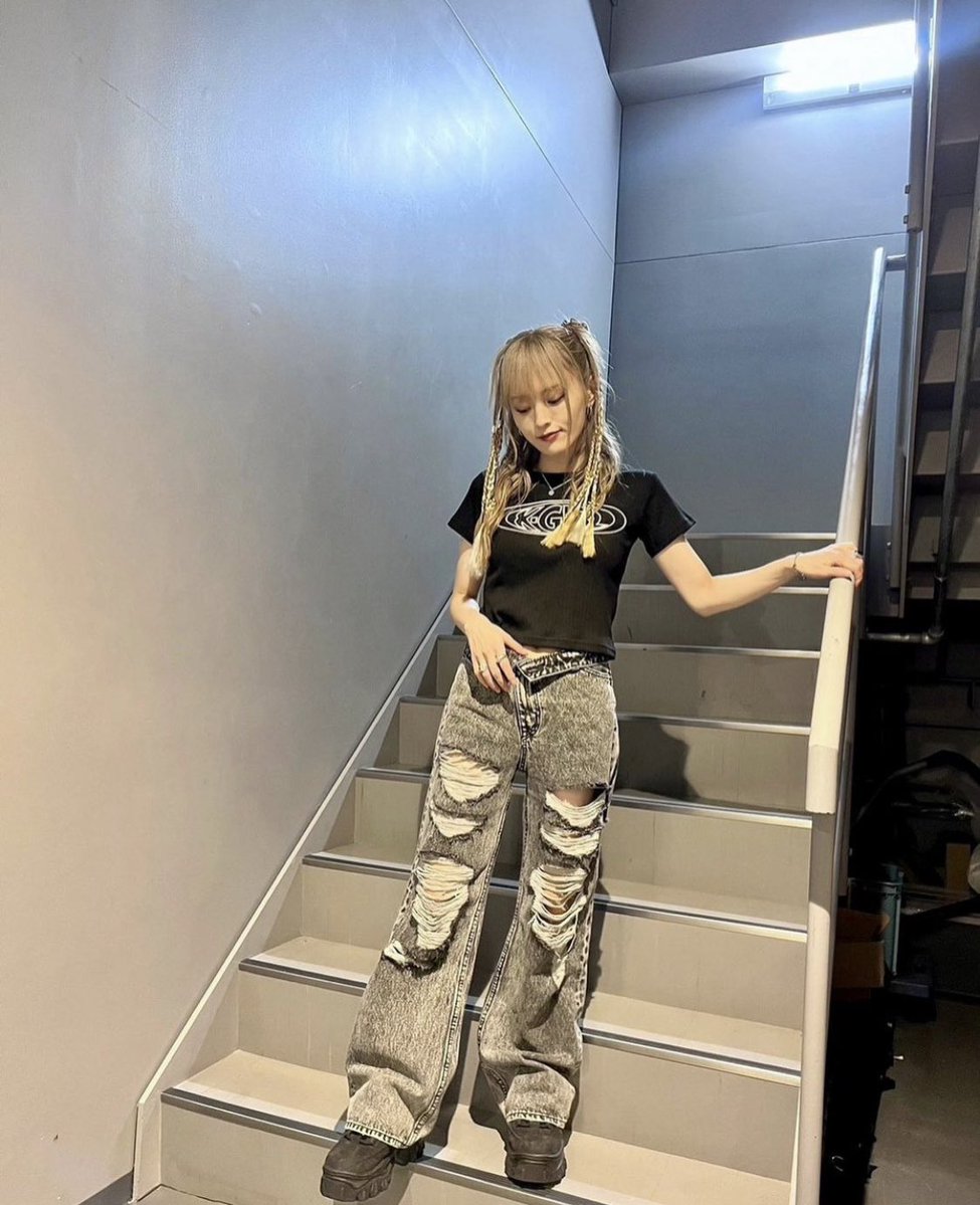 金髪を両サイドで三つ編みにし、黒のTシャツとダメージデニムを合わせた彼女の姿が複数の写真に収められている。